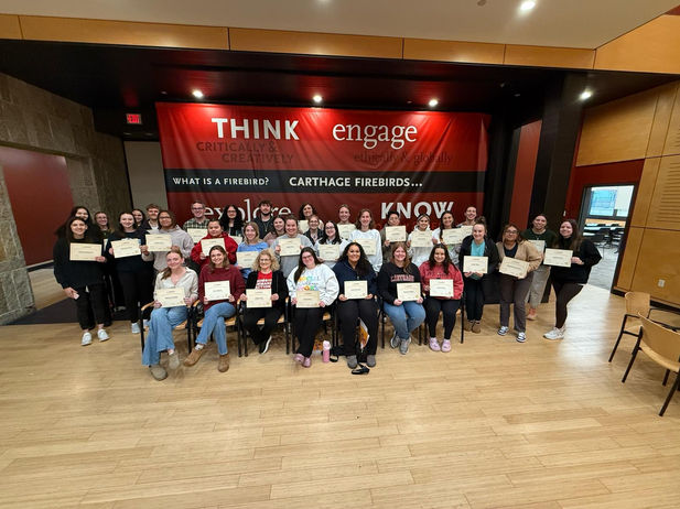 On March 30, Levi Stein, president and CEO of Friendship Circle in Milwaukee, came to campus to provide the safeTALK training to a group of Carthage students and staff. Participants learned how to notice people trying to talk about their suicidal thoughts and how we can ask, listen, and keep people safe (TALK) in response. All participants received safeTALK certification for their participation. This event was in conjunction with the “Terminal Exhale” play, which brought awareness of the heavy toll of gun violence on the lives of frontline healthcare workers who treat gun violence victims every day. Read more here.